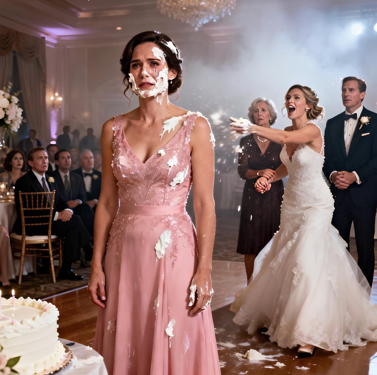 „Bola som pozvaná ako ‚rodina‘,“ pokračovala som. „A pred chvíľou som bola verejne ponížená a niekto po mne hodil svadobnú tortu – zatiaľ čo sa moji vlastní rodičia smiali.“