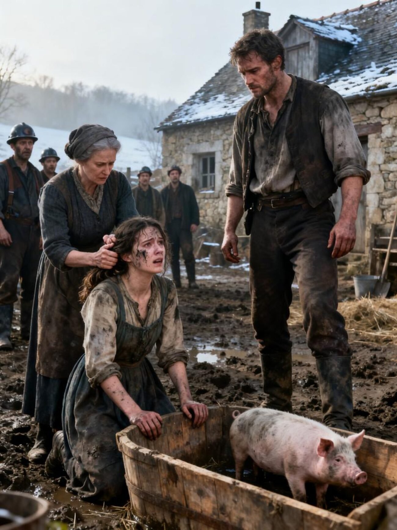 Elenina tvár dopadla na blato skôr, ako stihla zareagovať. Hrubá ruka ju zatlačila za zátylok a jej tvár sa ponorila do žľabu pre ošípané. Ústa a nozdry jej naplnil zatuchnutý zápach a kvasené jedlo. Snažila sa vyslobodiť, ale tlak sa len zvýšil.