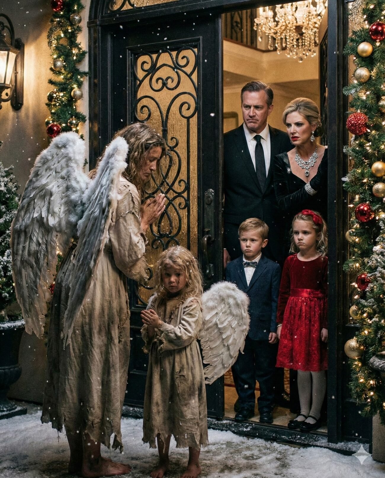 Dvaja anjeli, ktorí cestovali po zemi, hľadali jednej noci útočisko v luxusnom dome bohatej rodiny, očakávajúc aspoň skromnú pohostinnosť, ale namiesto toho objavili aroganciu a krutosť skrytú za leštenými mramorovými podlahami a trblietavými lustrami.
