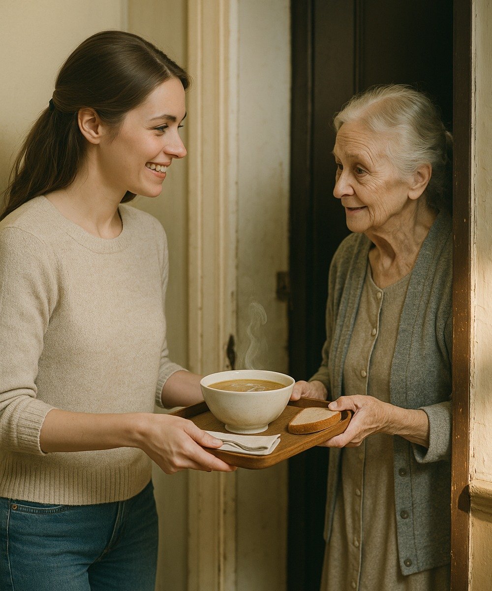 Jedného popoludnia som ju videla, ako sa namáhať s nákupom po schodoch. Bez rozmýšľania som jej ponúkla domáce polievku. Prijala ju s trasúcim sa úsmevom. „Si veľmi milá, drahá,“ povedala jemným hlasom.