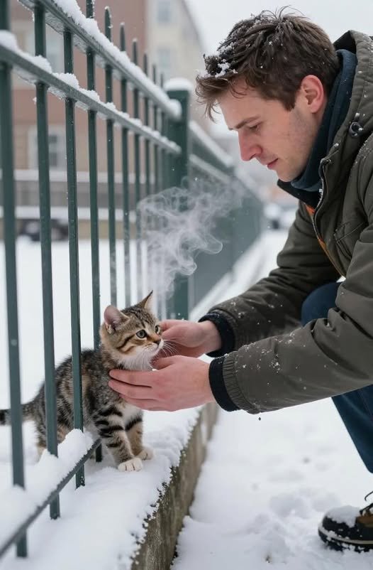 Po několika minutách se mi ho podařilo opatrně osvobodit. Kotě se hned přitulilo k mým nohám, jako by vědělo, že je v bezpečí. Krátce jsem ho pohladil a nechal ho v teplejším úkrytu u vchodu.
