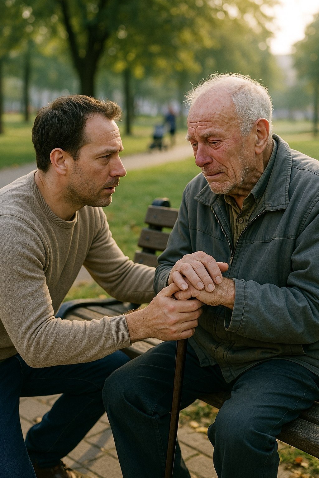 O desať minút som bežal po mokrej tráve malého parku za našou budovou. Ranné slnko už svietilo, prechádzali okolo matky s kočíkmi, niekde štekol pes. A na lavičke, uprostred tohto obyčajného života, sedel môj otec, Daniel, v starej šedej bunde, pevne zovierajúc palicu bielymi prstami. Jeho oči boli červené, tvár mokrá. Keď ma uvidel, snažil sa zdvorilo usmiať – tak, ako sa usmievaš na cudzieho človeka v autobuse.